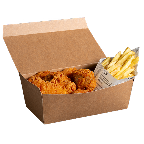 2 kawałki skrzydełek (do wyboru pikantne lub łagodne) 4 polędwiczki (do wyboru pikantne lub łagodne) frytki 150g